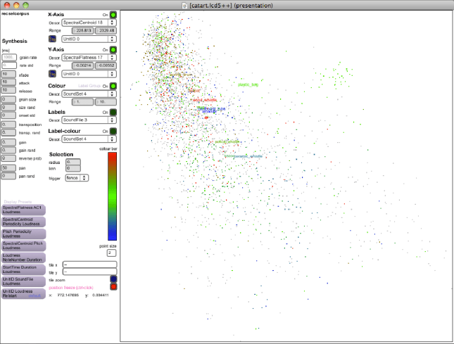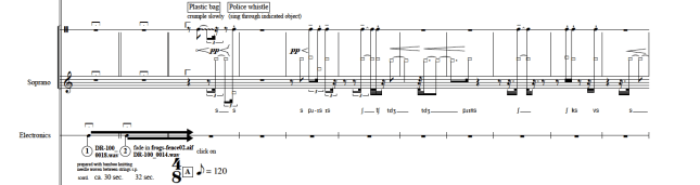 “In the plot, each dot represents a short sample as performed by Amanda DeBoer, and the axes correspond to the timbral qualities of the sounds. I explored this plot to assemble the samples into micro-montages, which I use in the electronic component of the work, or ask Amanda to recreate live. I also map them to other audio recordings, so that the performers are asked to recreate a recording of frogs, the sun, or of Wallace Stevens reading. Because samples of Amanda and the other players were my starting point, their unique sonic identities are woven into the fabric of the work as well.”