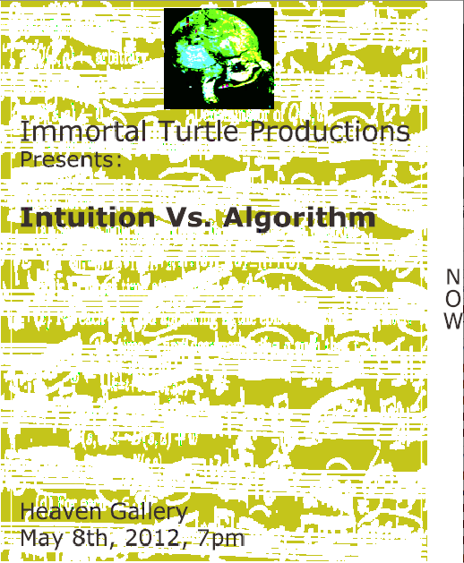 When I accepted the assignment to make a piece for this show, I was quite thrilled by the push and pull duality inherent in the phrase “Intuition/Algorithm”. After all, intuition is the deepest, rawest instinct of the human mind and we think of algorithms, when we think of them all, as the refined product of the right brained, never to be grasped easily except as part of an advanced degree. Except… we mention the latest algorithms so casually, designers wrapping them in friendly GUI to hide the bitterness of math, and make them sweet like music. They hide it when we ask our friends to “Google it” or in the marvel of a newborn learning to use his parent’s iPad, the trajectory of an angry bird. Design is increasingly the art of masking algorithm in intuition.